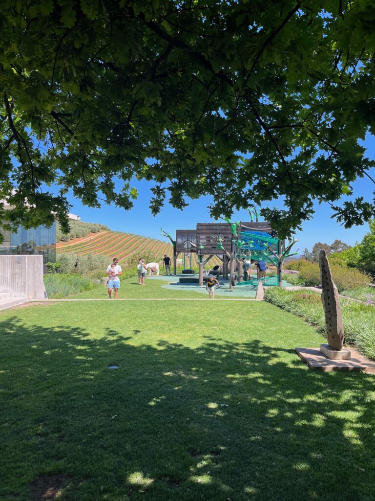 No parquinho ecológico, as crianças se conectam à natureza enquanto os adultos apreciam os vinhos e a gastronomia local.